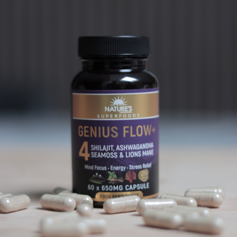 Genius Flow+ is a natural brain and body blend made with Lion’s Mane, Ashwagandha, Shilajit, and Sea Moss—designed to support focus, energy, stress relief, and mental clarity.