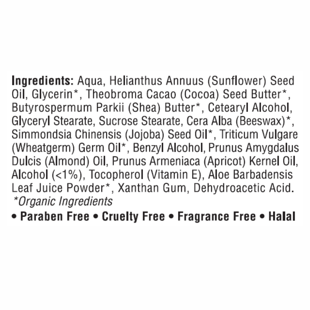 A clinically proven, organic-certified cream made with nourishing botanicals like cocoa butter, shea butter, jojoba oil and aloe vera. Designed to calm, hydrate and restore sensitive skin naturally.